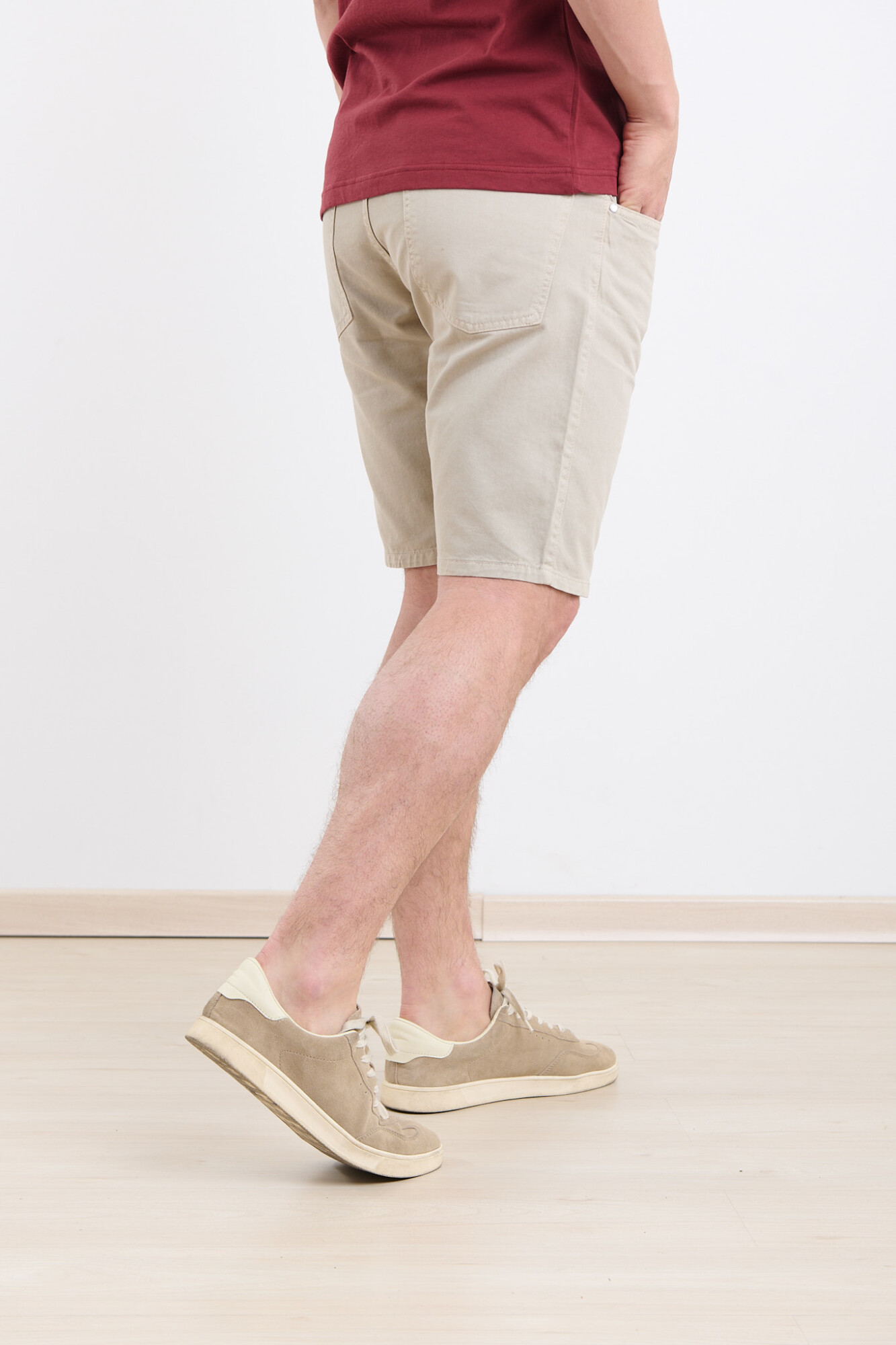 Bermuda corte 5 bolsillos, 100 % algodón con lavado. Botones y remaches de metal plata viejo. Colores de moda, bolsillos delanteros y tipo parche atrás. Corte regular.