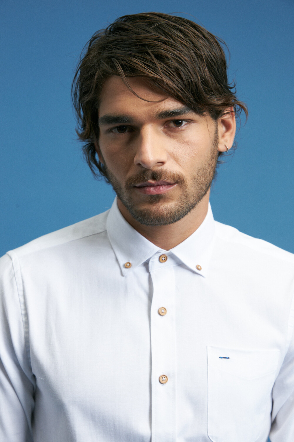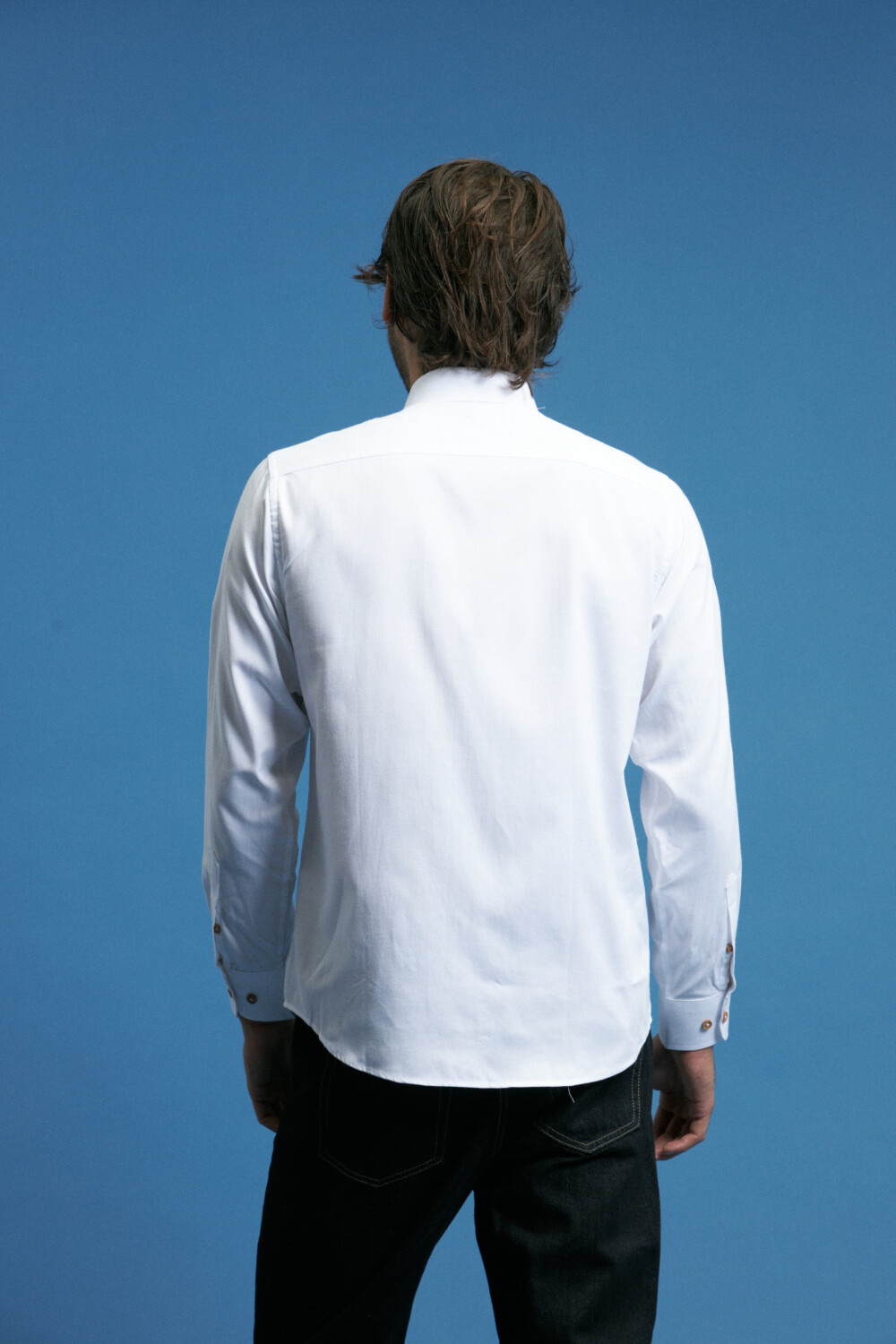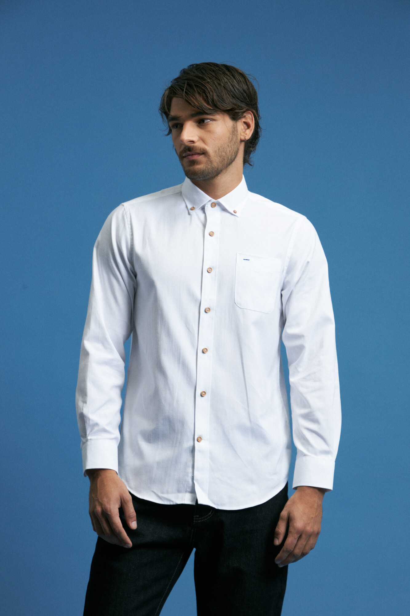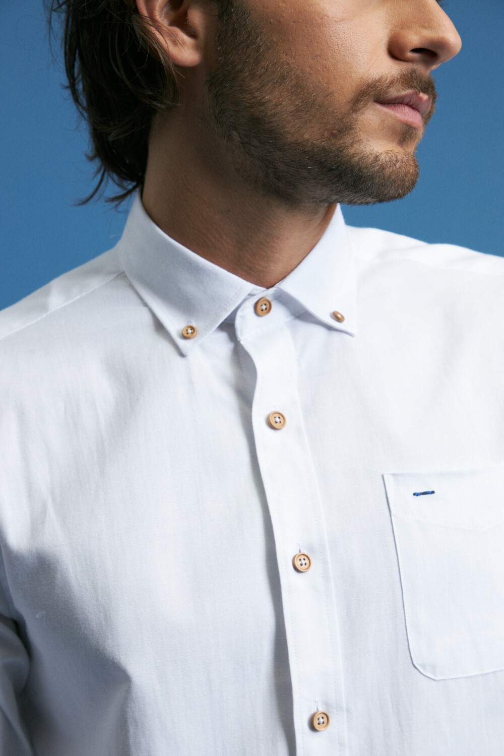 Cuello button-down, bolsillo frontal y botones de madera.