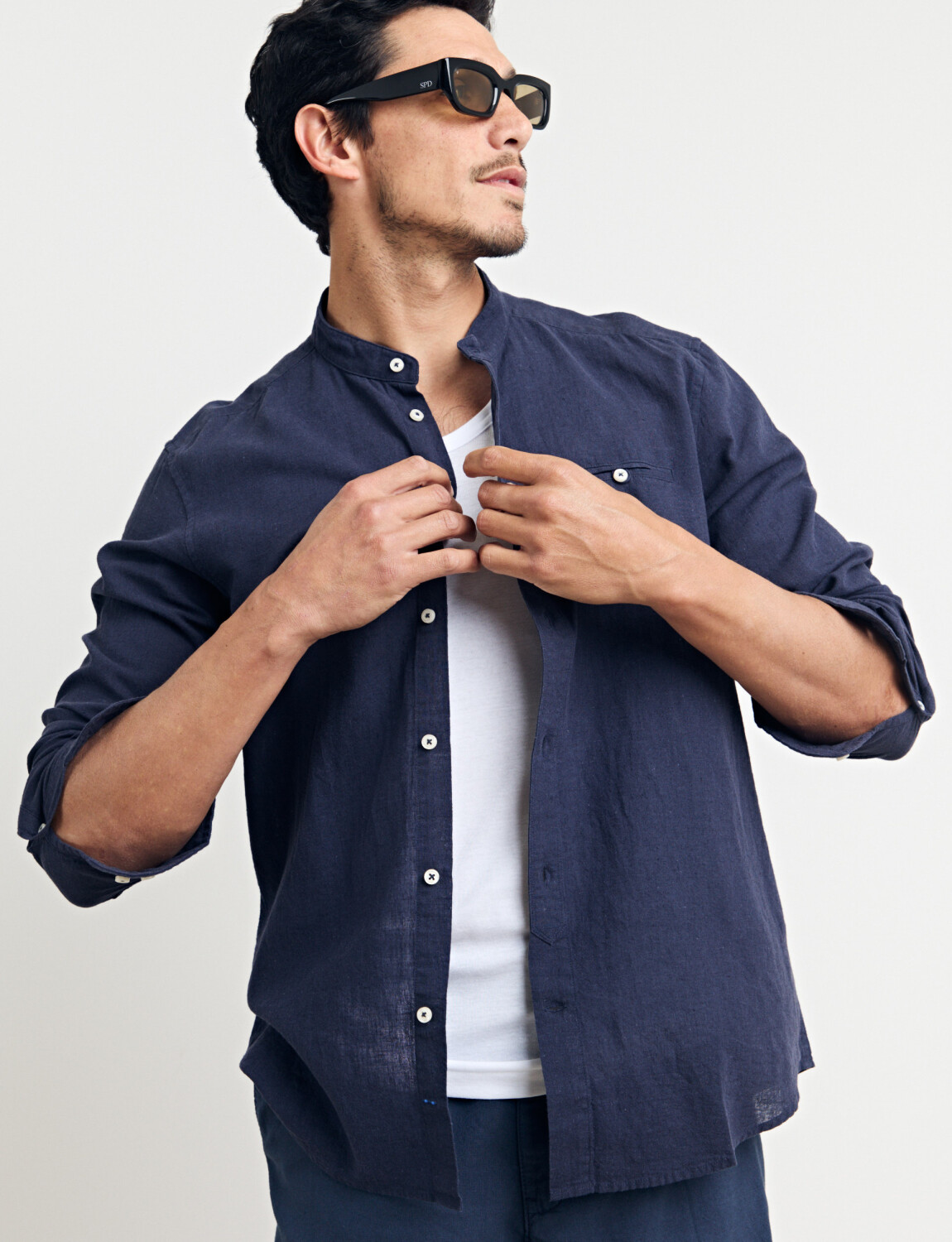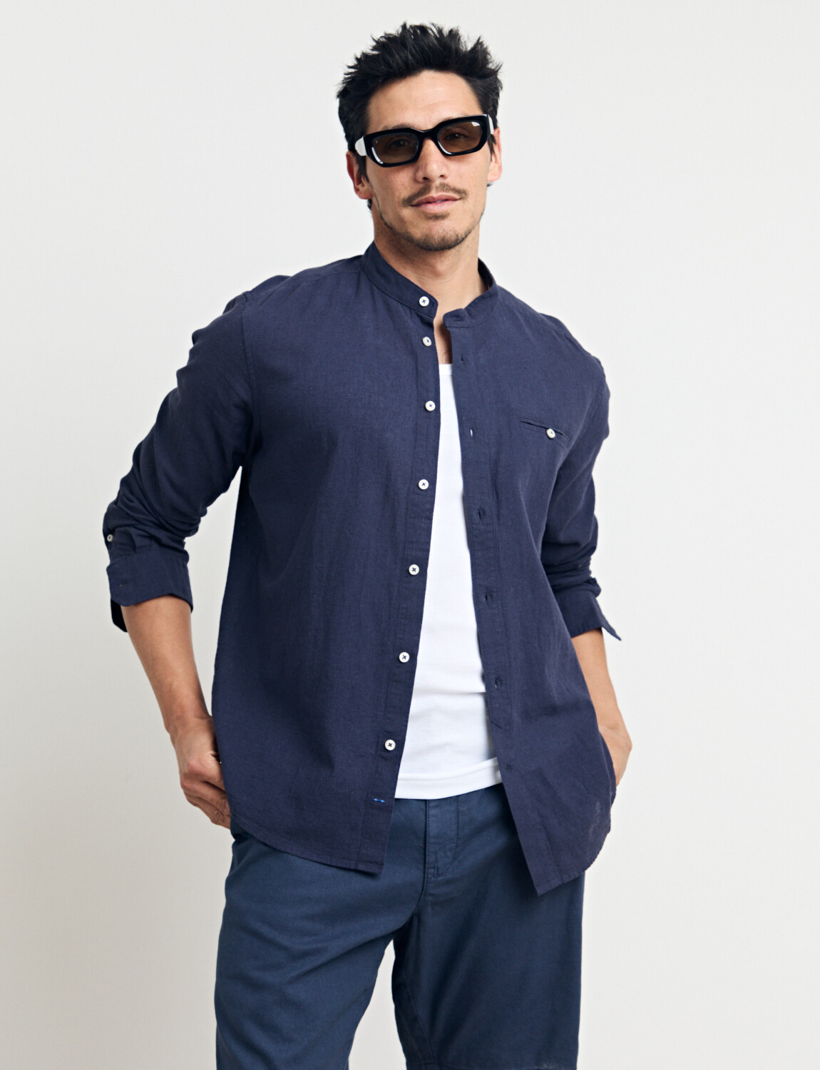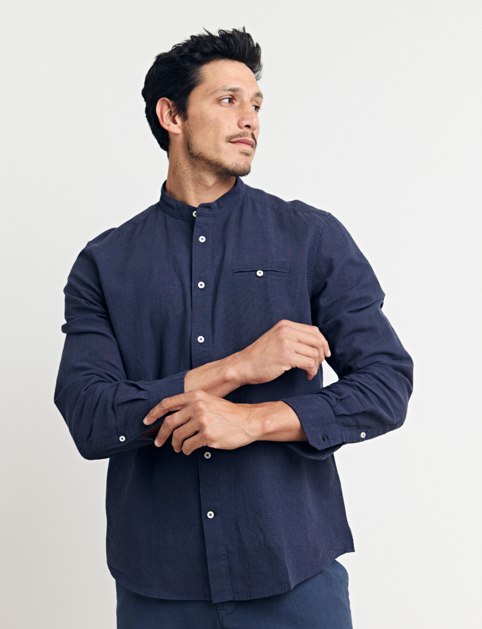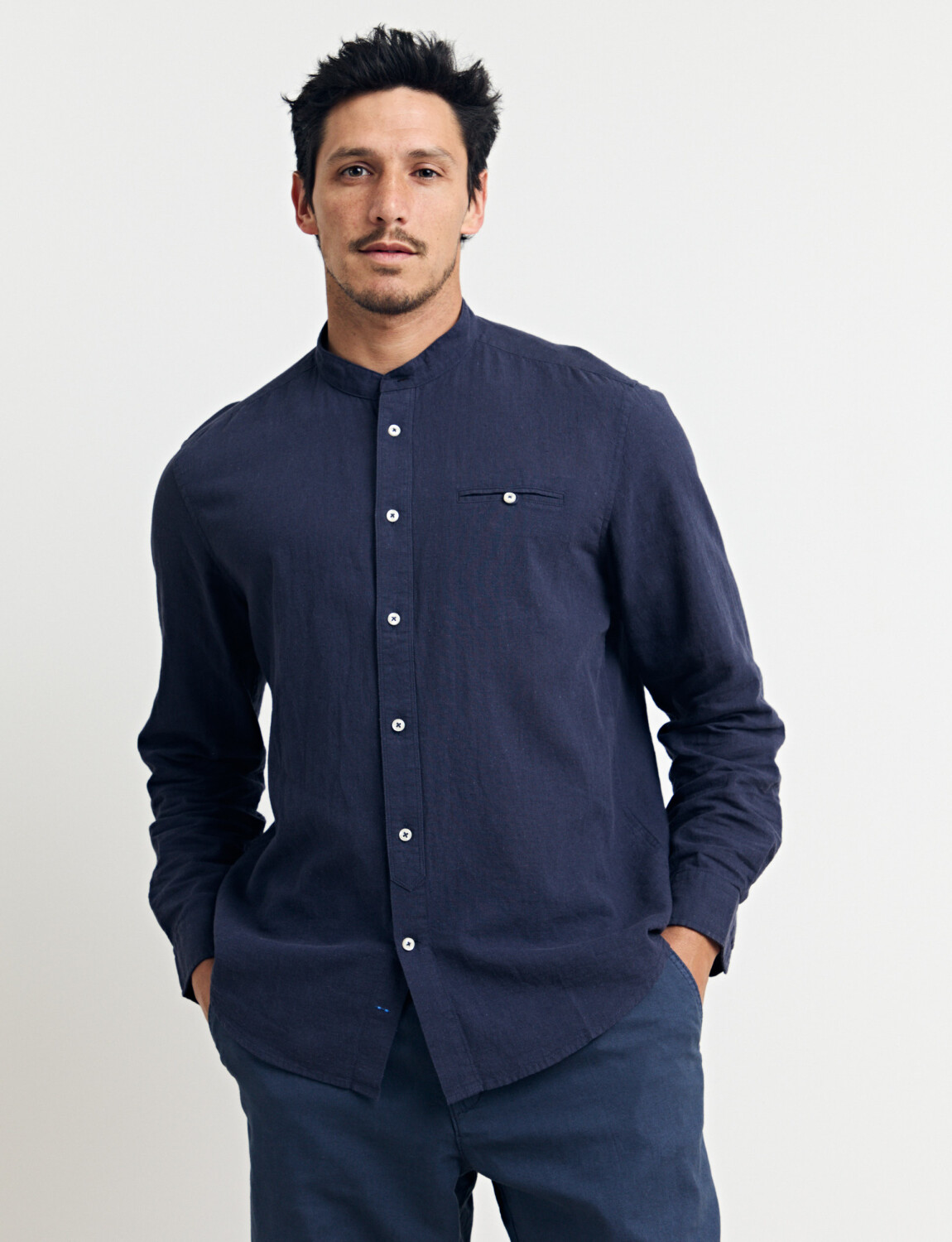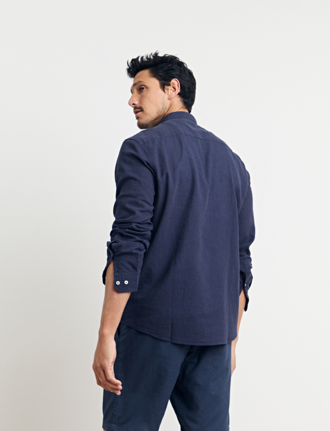 Camisa cuello mao, manga larga, línea premium.