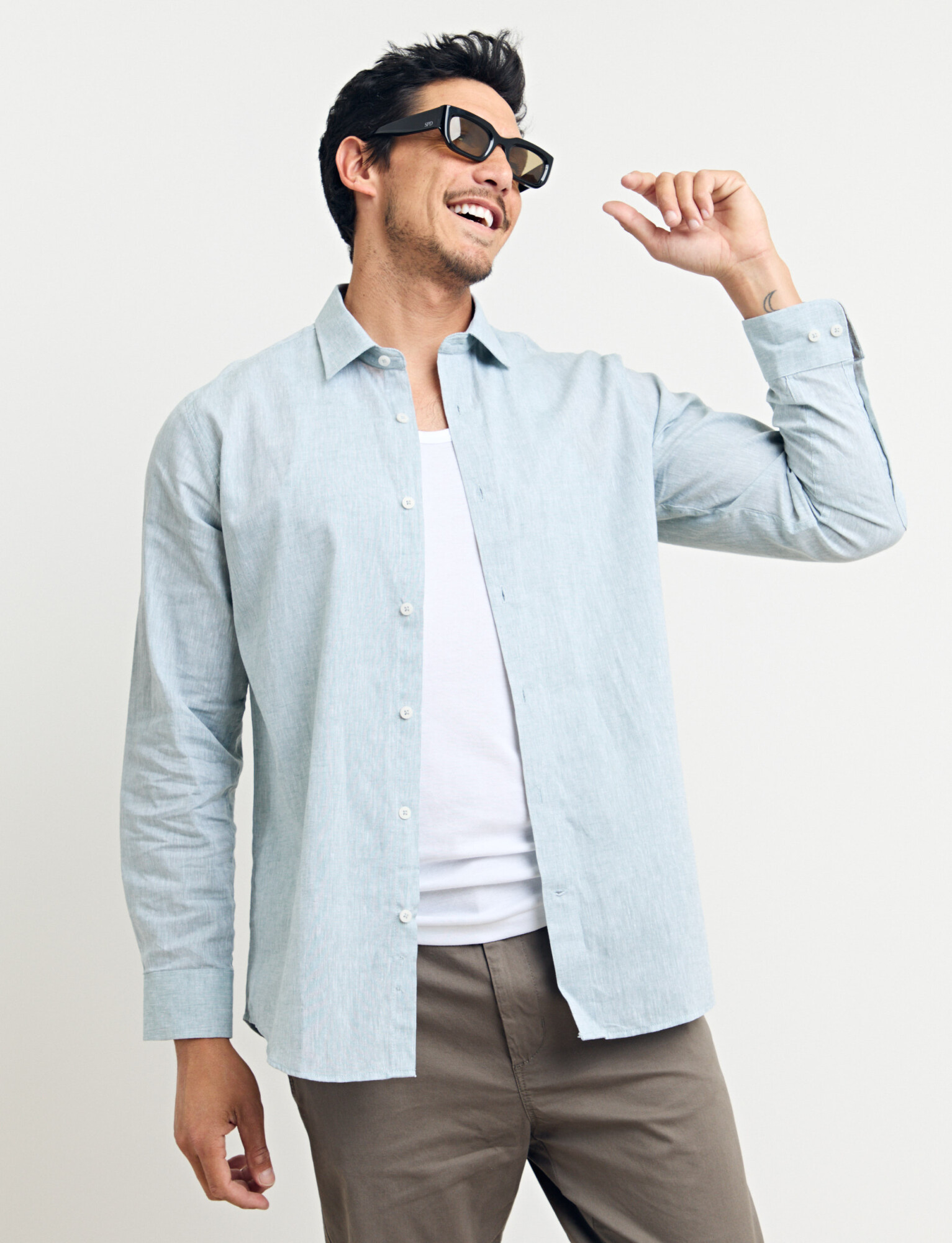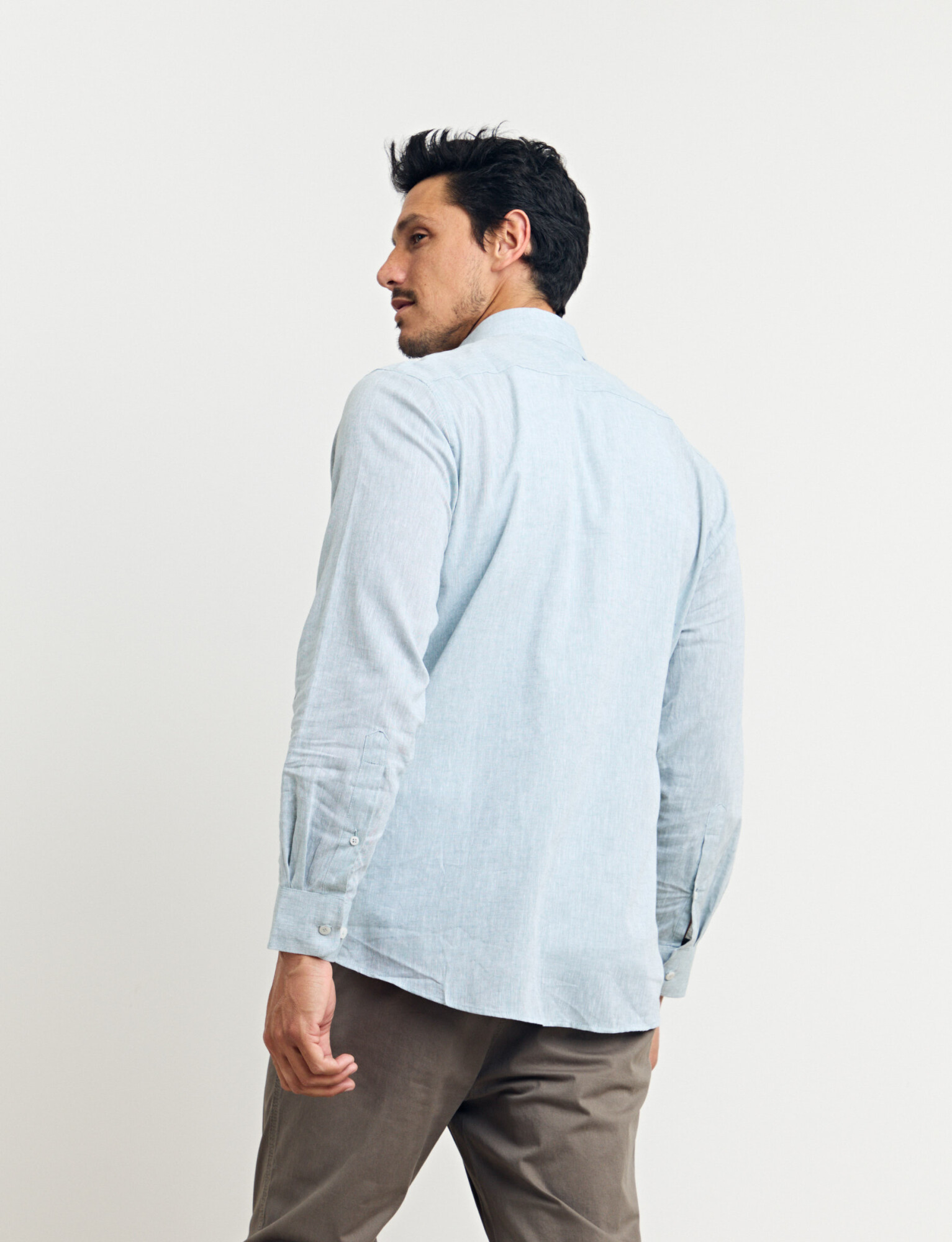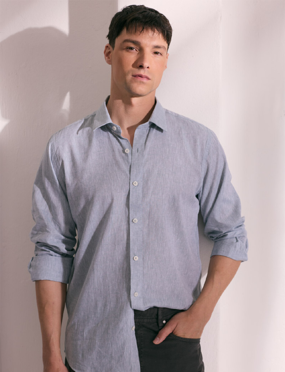 Camisa sport cuello buttondown, manga larga. Fabricada con tejido 55% Algodón 45% lino, mezcla perfecta entre la rusticidad del lino y la suavidad del algodón. Colores de moda
