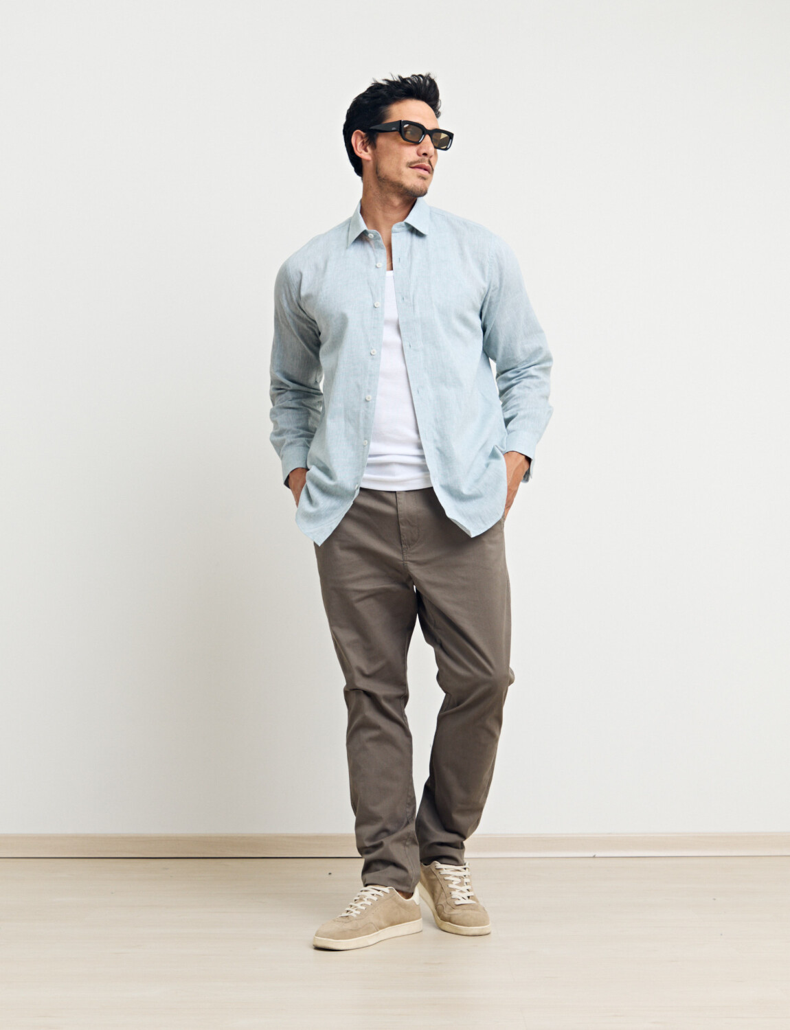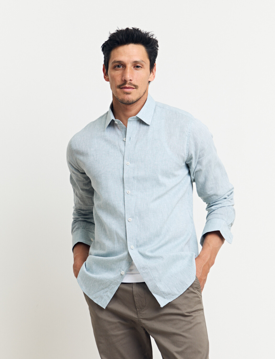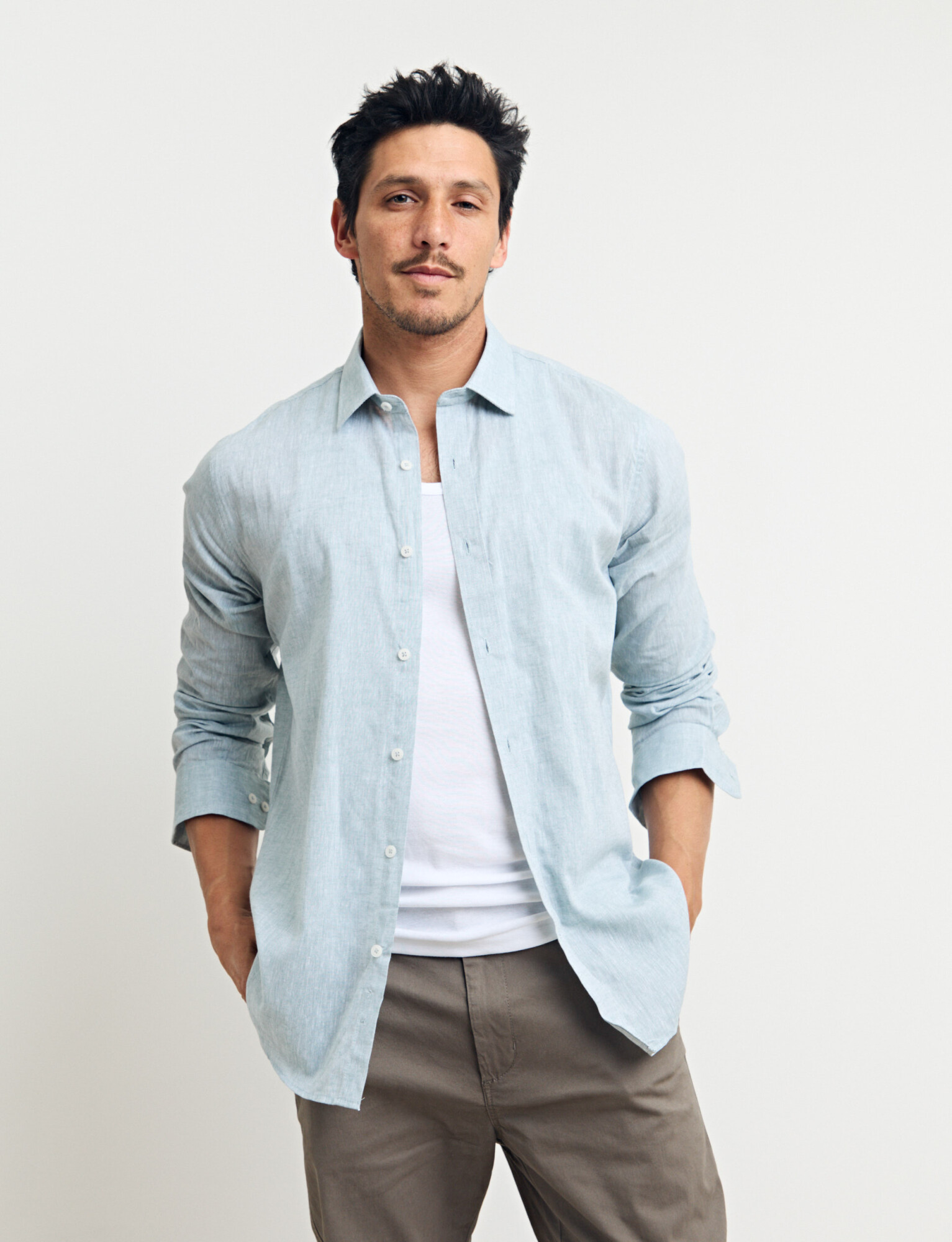 Camisa sport cuello buttondown, manga larga. Fabricada con tejido 55% Algodón 45% lino, mezcla perfecta entre la rusticidad del lino y la suavidad del algodón. Colores de moda