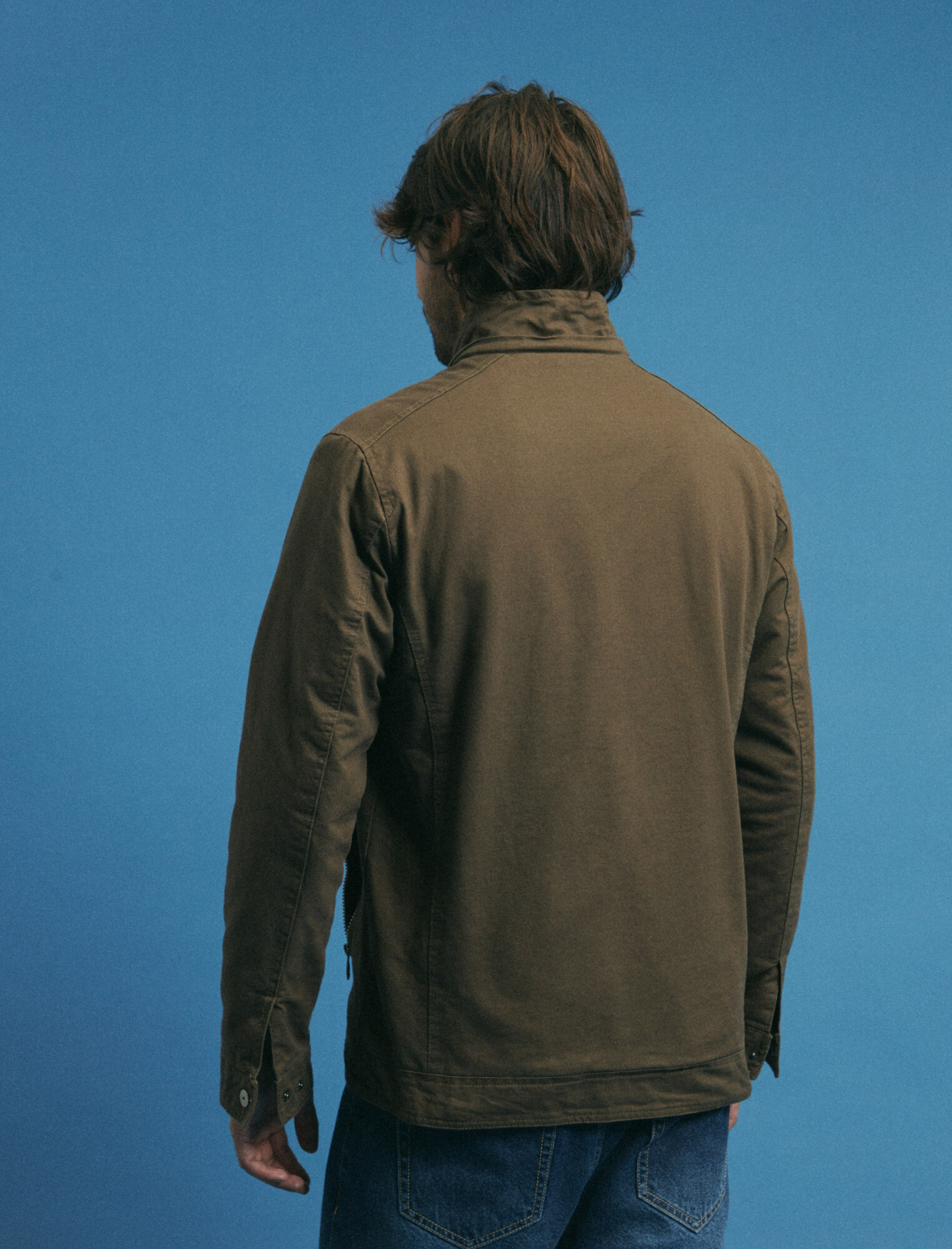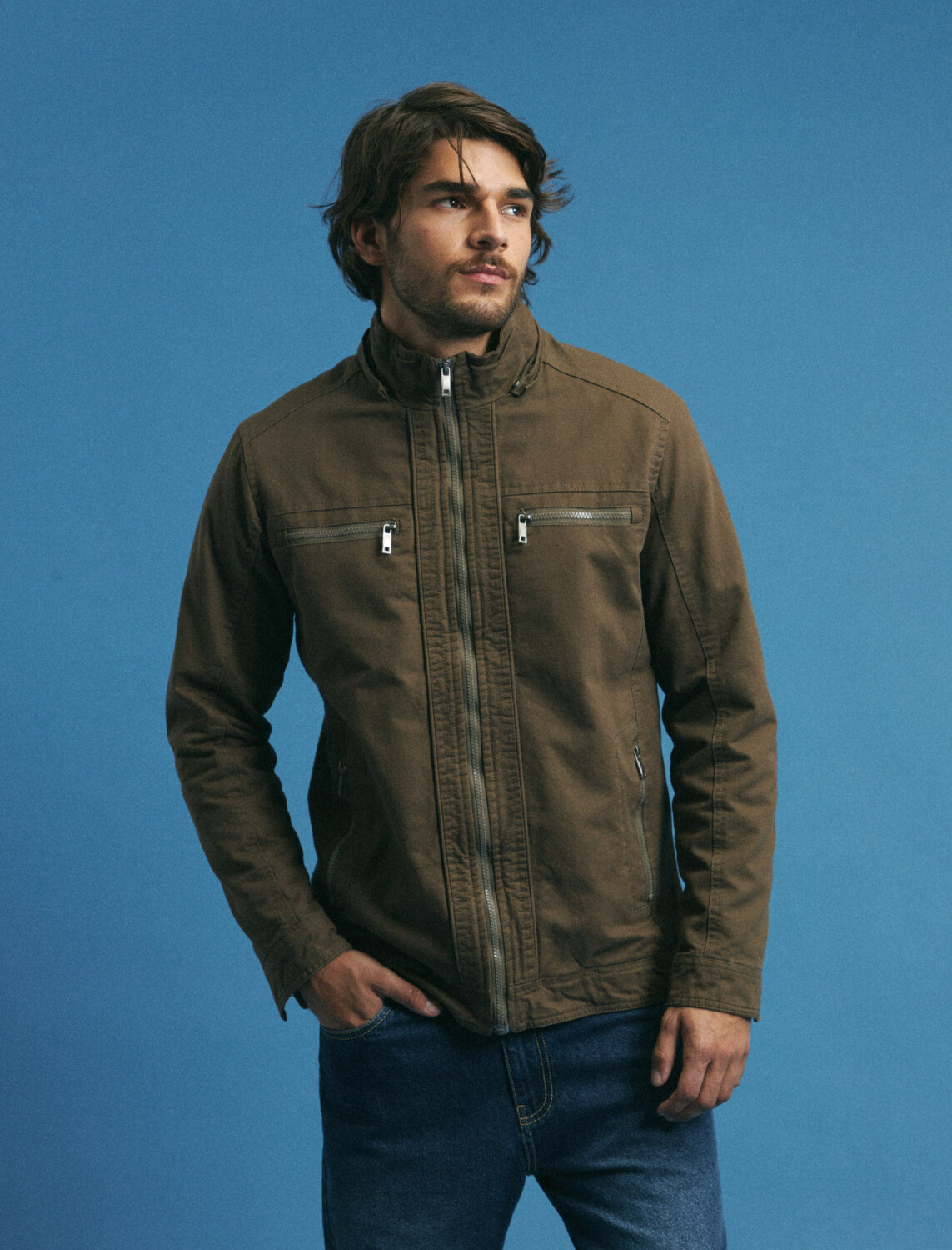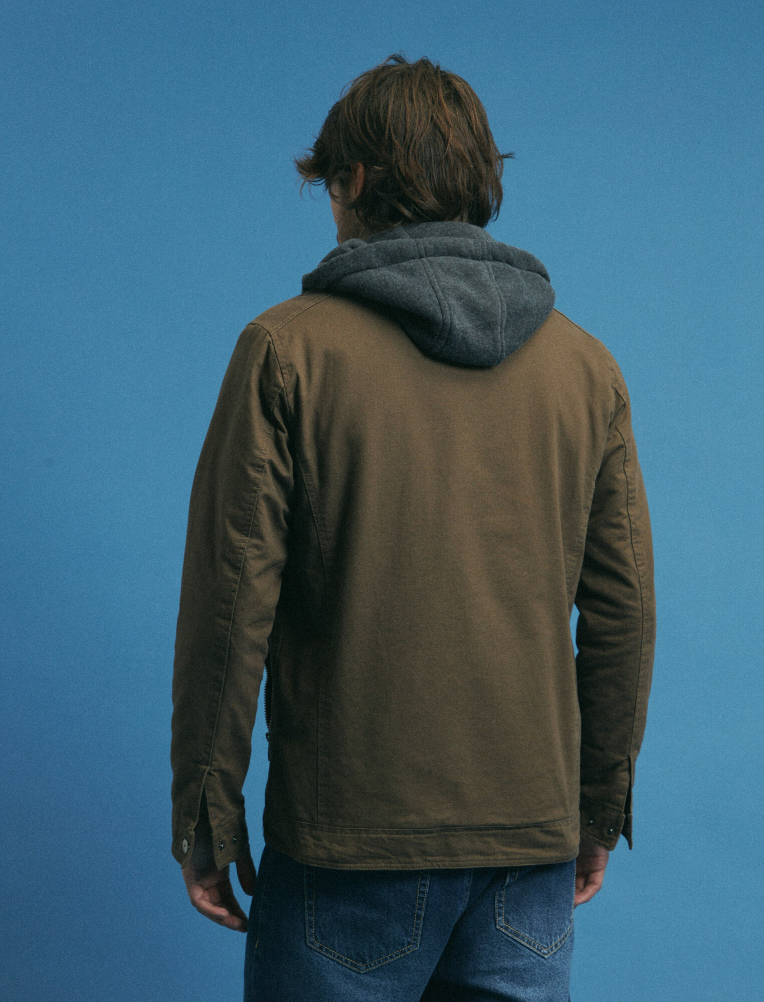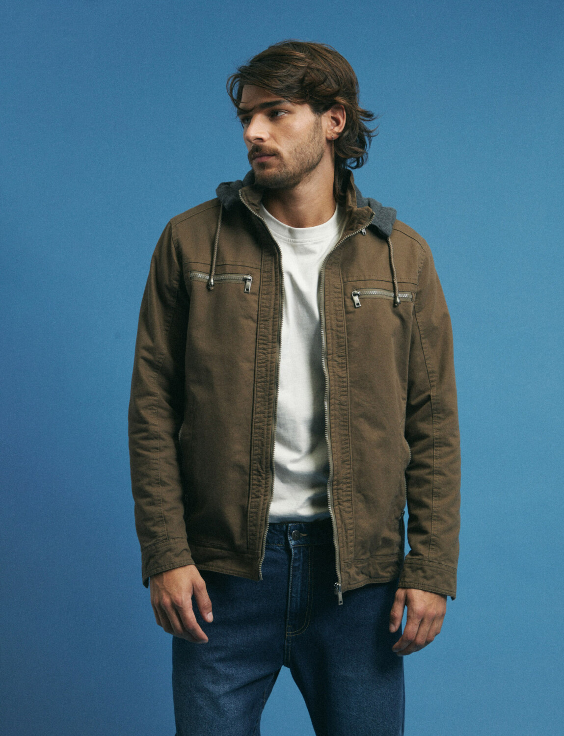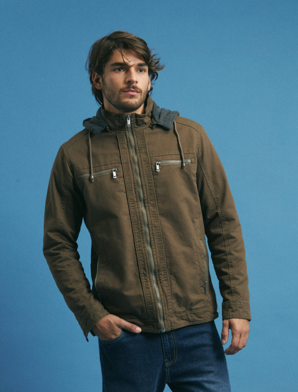 Manga larga con capucha, cierre frontal y laterales engomados. Bolsillos laterales de ribete. Forro micro polar. Tiradores a contratono y ruedo con ajustadores internos.