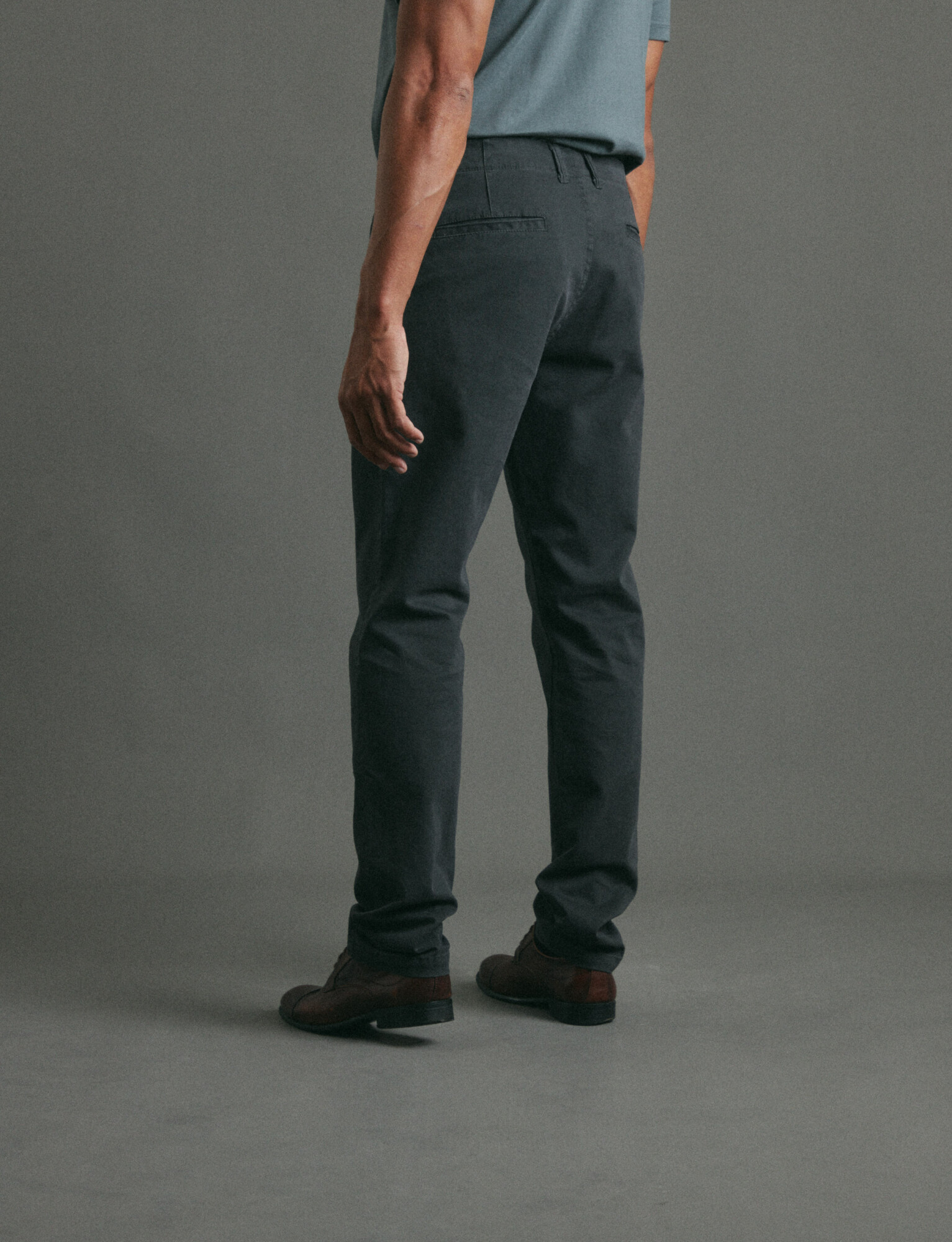 Corte clásico con bolsillos delanteros inclinados y bolsillos traseros de ribete.