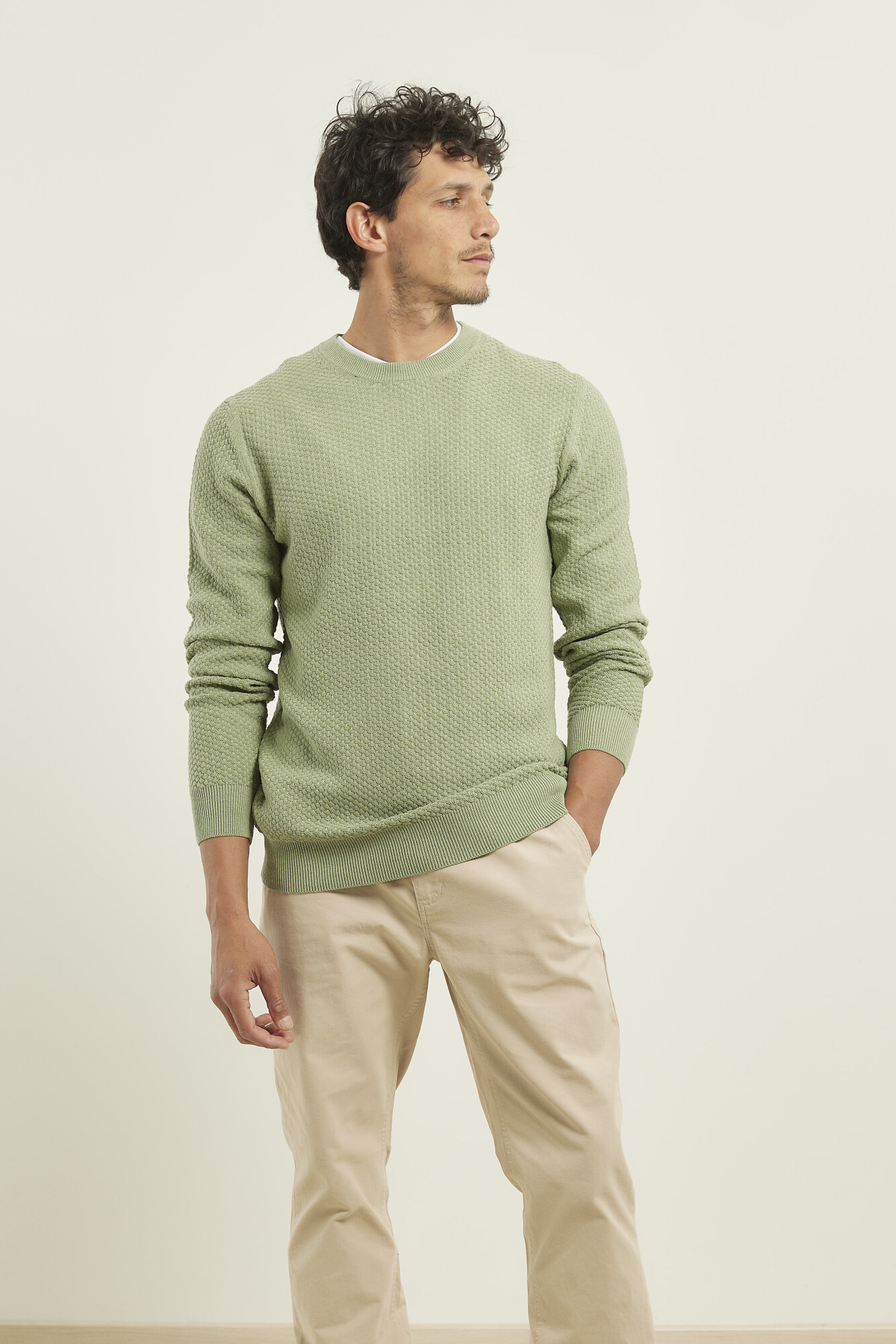 Tejido con estructura fantasía tipo punto abeja. Cuello redondo. Manga larga.